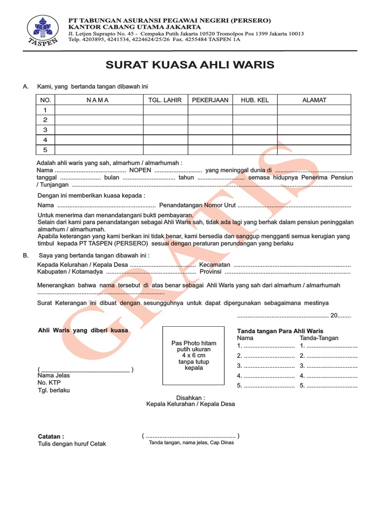 Contoh surat keterangan ahli waris selamat pagi sahabat semuanya dimanapun anda berada. Contoh format ini saya ambil dari contoh pada pengambilan uang pensiunan di bank untuk almarhum ayah admin. Aturan aturan umum tersebut diantaranya adalah sebagai berikut. Diantaranya untuk mengurus taspen pembatalan haji dan pengambilan tabungan.