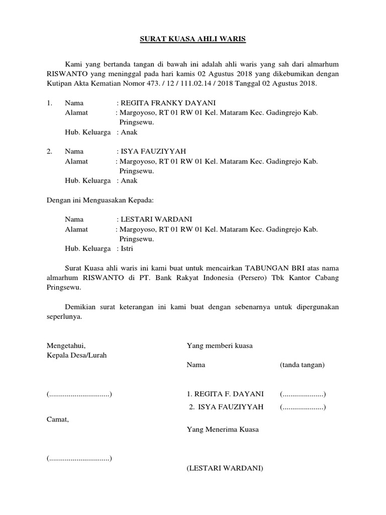Contoh surat kuasa ahli waris bank. Contoh surat kuasa ahli waris bank bri.Surat keterangan ahli waris merupakan surat keterangan yang isinya adalah pernyataan bahwa pihak pembuat surat keterangan ahli waris tersebut memang benar benar berhak atas segala sesuatu yang diwariskan oleh seseorang. 110 112 rt. Surat kuasa bermeterai jika tidak semua ahli waris mengambil ke bank.