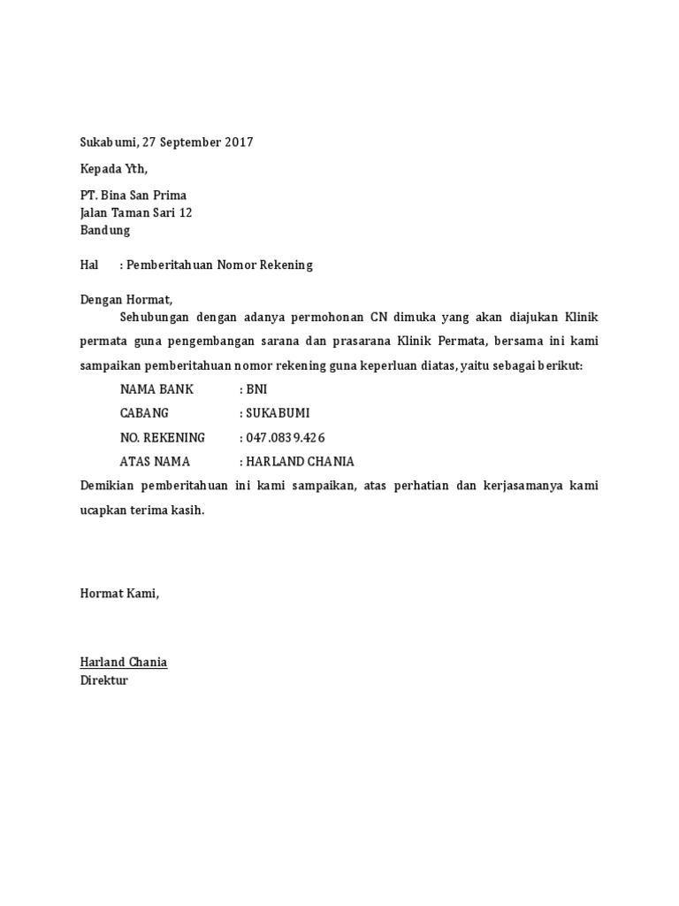 Contoh surat pemberitahuan rekening bank perusahaan