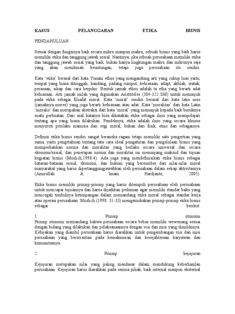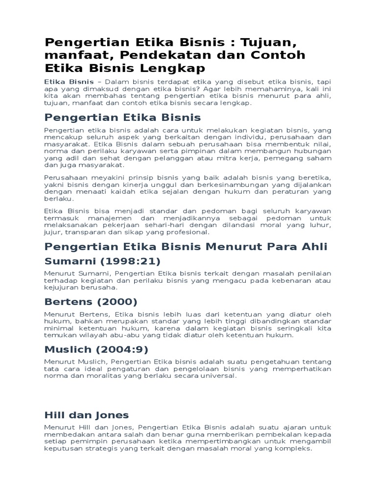 12 Jul 2021 — Etika bisnis adalah cara untuk berbisnis dan meliputi semua bagian yang berhubungan dengan perusahaan, masyarakat, dan individu. Peran dari ...