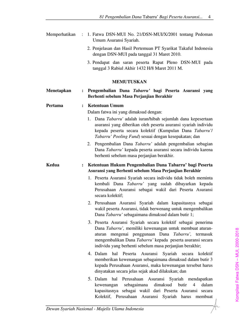 Fatwa dsn mui tentang asuransi syariah. by F Husen · 2021 — Standard contracts in sharia insurance products must be adjusted to the fatwa of the Sharia Council of the Indonesian Ulema Council (DSN-MUI). Menetapkan: FATWA TENTANG PEDOMAN UMUM ASURANSI SYARI'AH: Pertama: Ketentuan Umum. Asuransi Syariah (Ta'min, Takaful atau Tadhamun) adalah ...