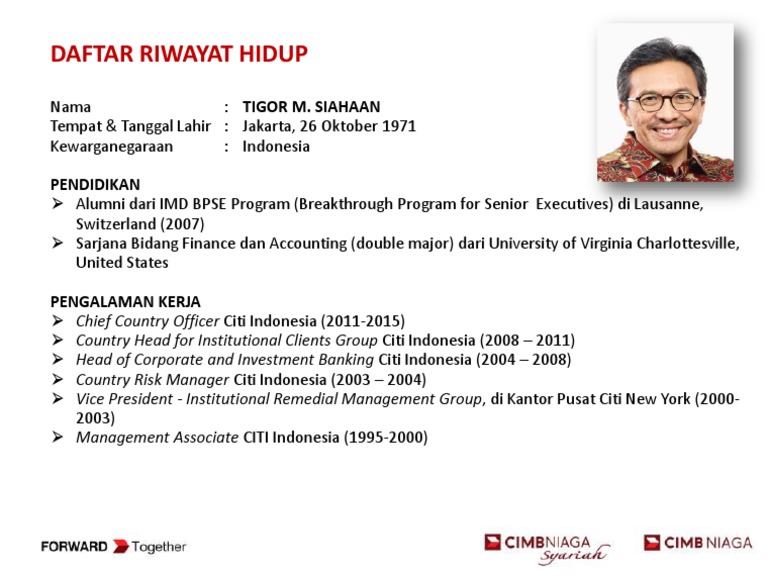 Tigor Siahaan - Endeavor Indonesia Tigor M. Siahaan is the former President Director and Chief Executive Officer of PT Bank CIMB Niaga Tbk. Prior to joining CIMB Niaga, he spent 20 years in Citi, starting as a Management Associate in 1995. His last position was the Chief Country Officer of Citi Indonesia, a role he assumed from 2011. He was the first Indonesian to be appointed ... Tigor Siahaan Joins Emtek-Grab's Digital Bank | D-Insights Oct 25, 2021 · Senior banker Tigor M. Siahaan officially resigned as PT Bank CIMB Niaga Tbk (BNGA) President Director and CEO after almost seven years in charge of the Malaysia investor's bank. Tigor will reportedly lead a digital bank integrated with the digital business ecosystem, which results from a joint venture between the Elang Mahkota Teknologi (Emtek ... CIMB Niaga Tunjuk Tigor Siahaan jadi Presdir - KOMPAS.com Tigor Siahaan (dok cimb niaga) Editor Bambang Priyo Jatmiko JAKARTA, KOMPAS.com - PT Bank CIMB Niaga Tbk menunjuk Tigor M. Siahaan sebagai Presiden Direktur baru menggantikan Arwin Rasyid yang mengundurkan diri. Pengangkatannya akan menunggu persetujuan dari Rapat Umum Pemegang Saham (RUPS) serta juga regulator.