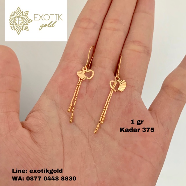 Rekomendasi Model Anting Emas 1 Gram Terbaik | Internet ... Cek kadar model anting emas 1 gram dan pastikan ada sertifikat Saat memilih anting emas, Anda pasti menemukan anting yang terbuat dari emas 24 karat hingga 9 karat. Emas 24 karat biasanya memiliki harga yang paling mahal karena kandungan emasnya mencapai 99,99%. Namun, model anting emas 1 gram mudah tergores karena sifatnya cenderung lunak.