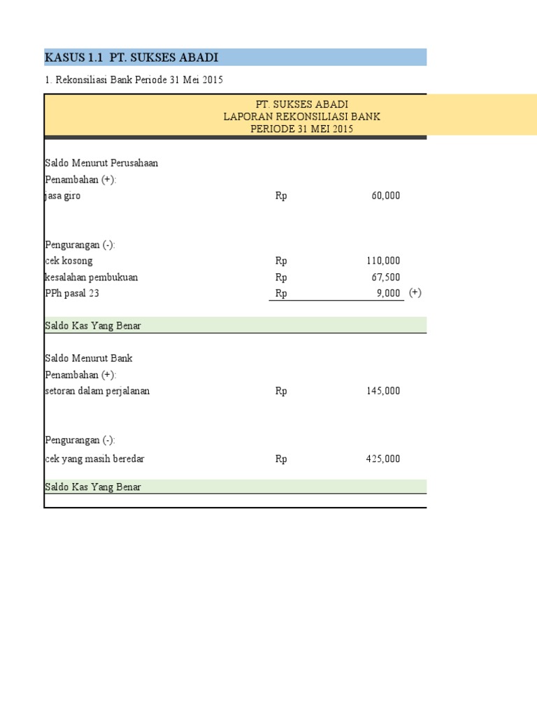 Tips Rekonsiliasi Bank dan Cara Membuat Laporannya Contoh Proses Rekonsiliasi Bank. Pada gambar di atas kita bisa baca bahwa laporan rekening bank menunjukkan saldo Rp 3.359.780 (misalnya per 31 Mei 2018).. Sedangkan saldo kas dalam buku besar PT Go Berkah pada tanggal yang sama adalah Rp 2.459.990. Cara Menyusun Rekonsiliasi Bank Lengkap dengan Contoh Soal Contoh Soal Rekonsiliasi Bank. Saldo Kas PT Prima sentosa menurut catatan buku besar kas per 31 Agustus 2011 adalah sebesar Rp 65. 200. 000 sedangkan menurut rekening koran yang diterima dari bank sebesar Rp 78.400.000, setelah diadakan pemeriksaan, penyebab perbedaan tersebut adalah: Bank telah menagih piutang wesel perusahaan nominal Rp 13 ...