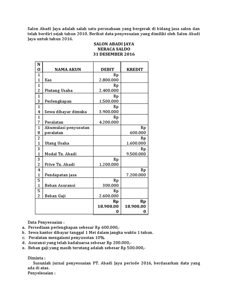 PA1: Ayat Jurnal Penyesuaian - lms global Jurnal penyesuaian disusun berdasarkan data dari neraca saldo dan data (informasi) penyesuaian akhir periode. ... Desember, Asuransi Dibayar Dimuka, 600.000 ...